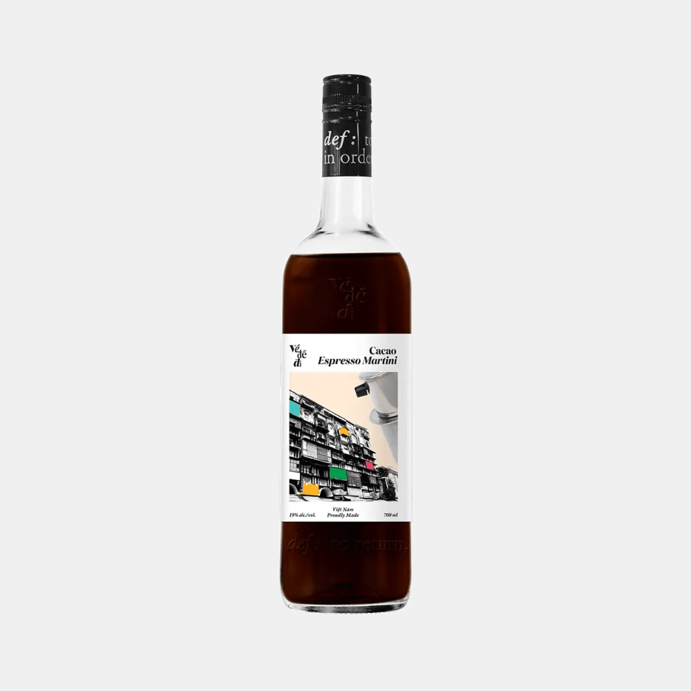 Ve De Di Cacao Espresso Martini 700ml is a premium ready-to-pour cocktail that redefines the classic espresso martini with distinct Vietnamese flair. Expertly blended using Về Để Đi Right Rum, their signature Crème de Cacao (macerated with single-origin cacao nibs from Marou Faiseurs de Chocolat in Lâm Đồng), Bến Tre coconut, and robust cold brew coffee.